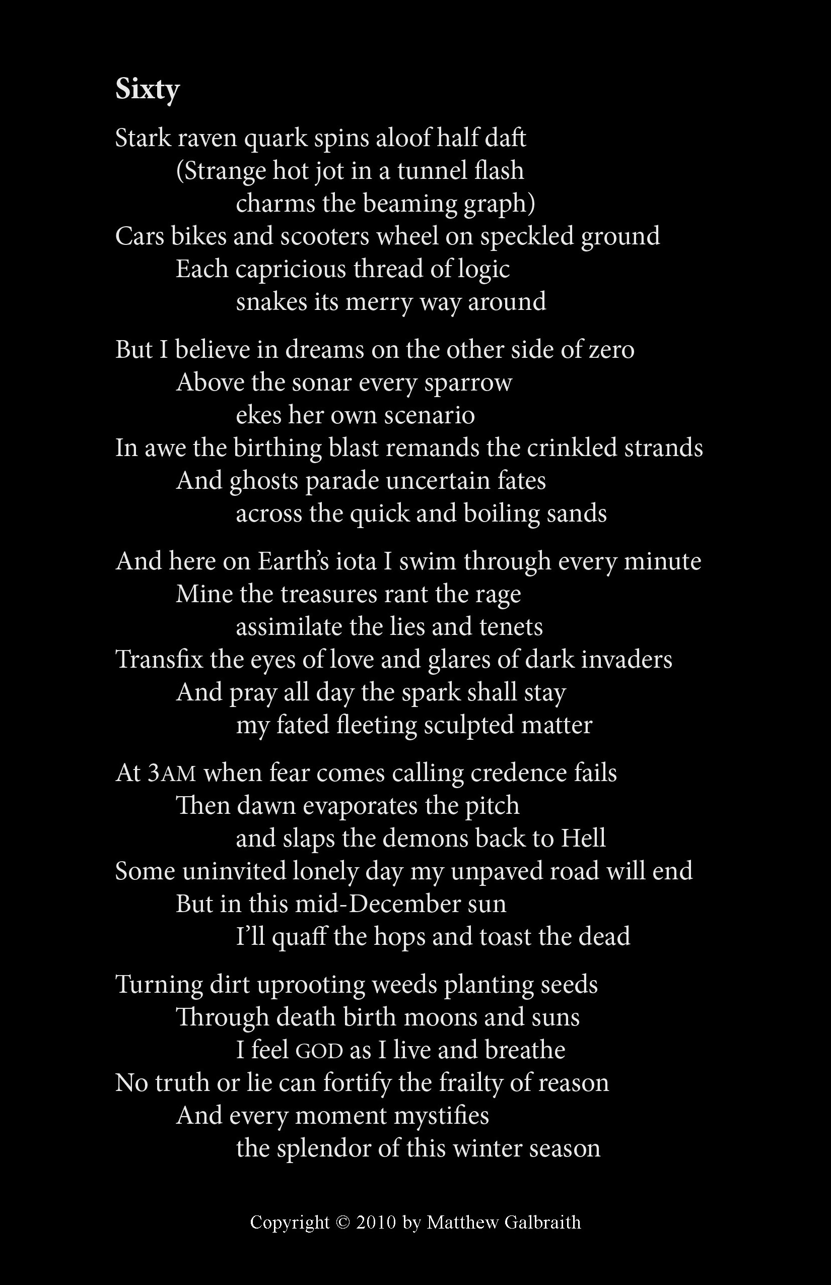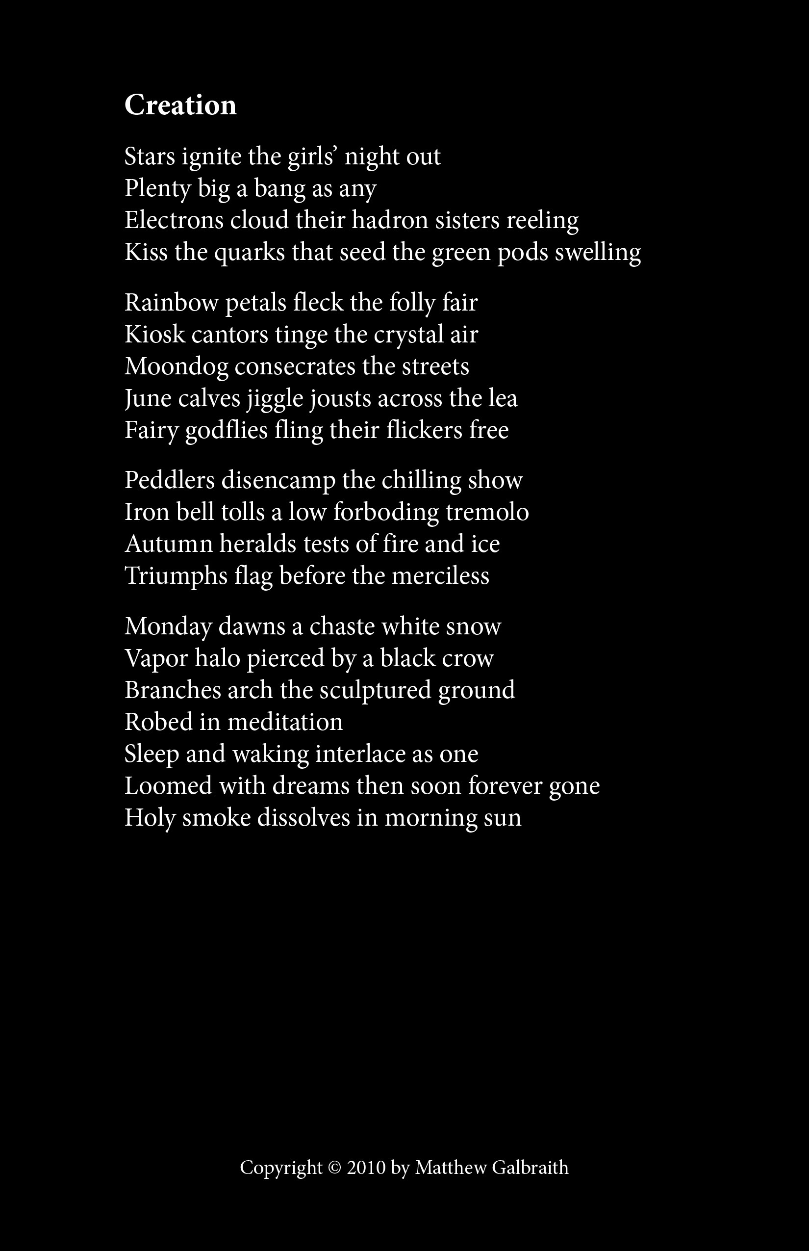 In a starburst of vibrant images both lavish and spare, cerebral and visceral, Galbraith confronts some of life's arcane mysteries: the hazy boundaries between otherworldly dreams and dreamy realities, the tangled inscrutable cosmos, and the wondrous miracle of each minute of life on our lonely planet.
